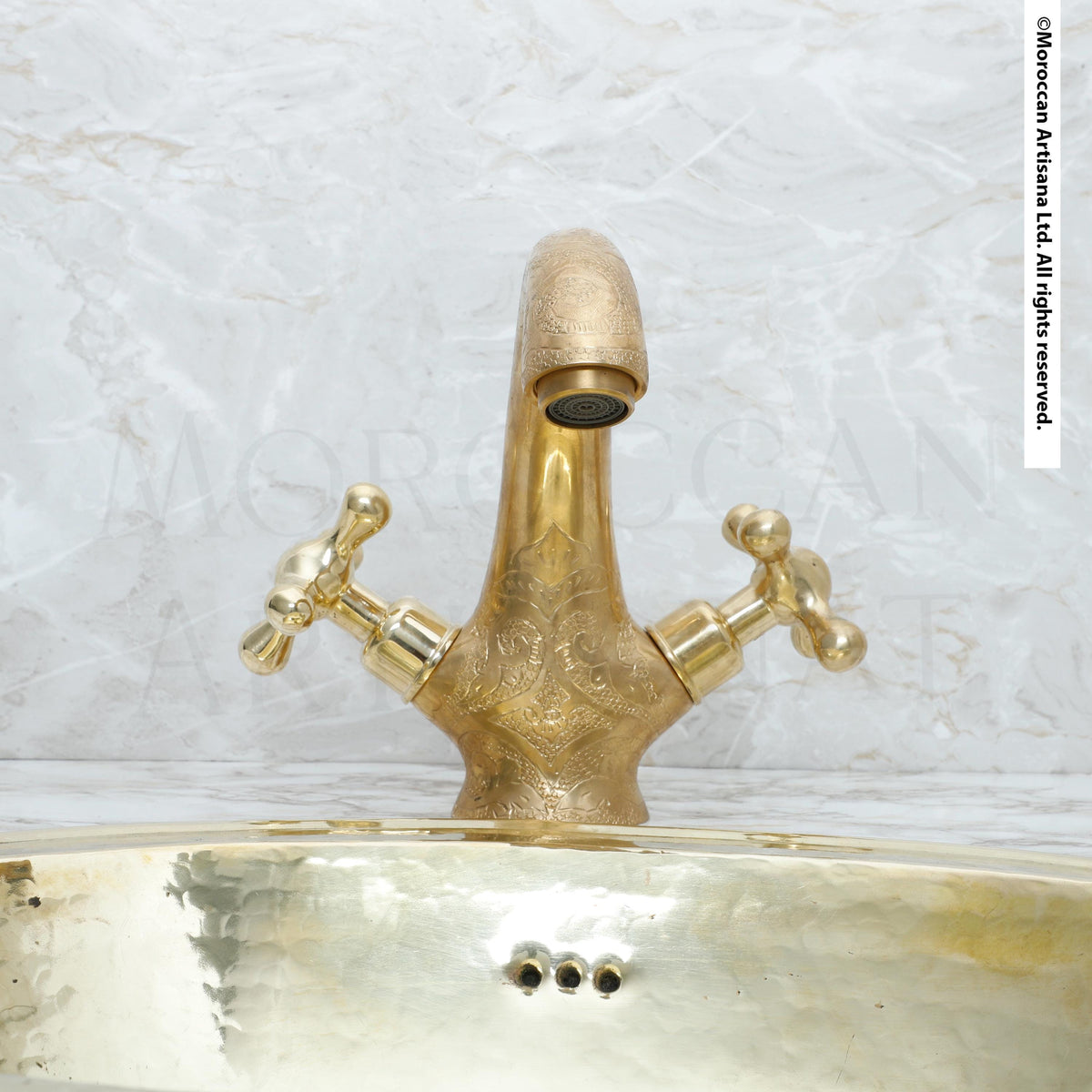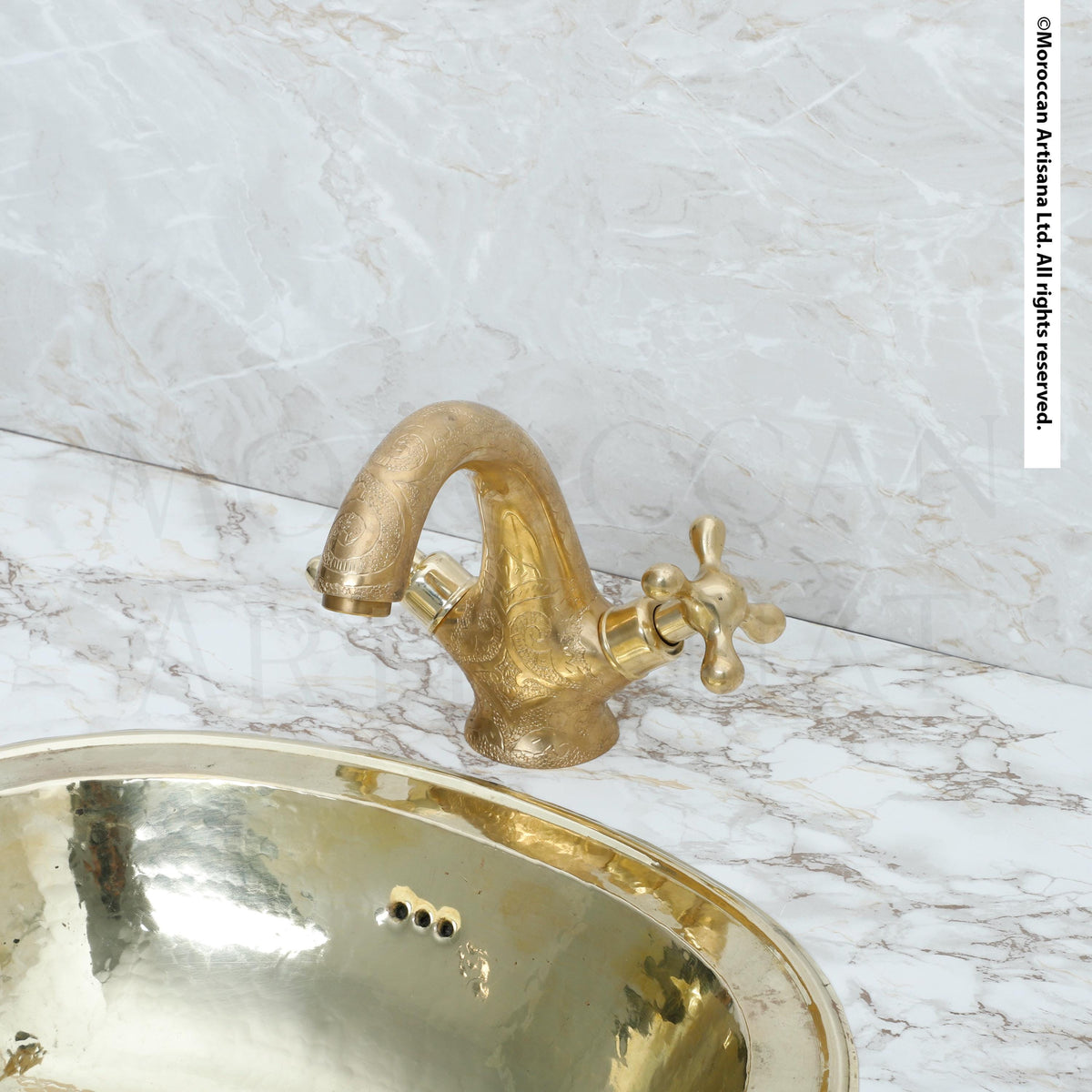 Add timeless charm to your bathroom with this Engraved Brass Faucet, handcrafted in Morocco by skilled artisans. Not only is this faucet a functional fixture, but it also serves as a statement piece with its intricate, hand-engraved details.