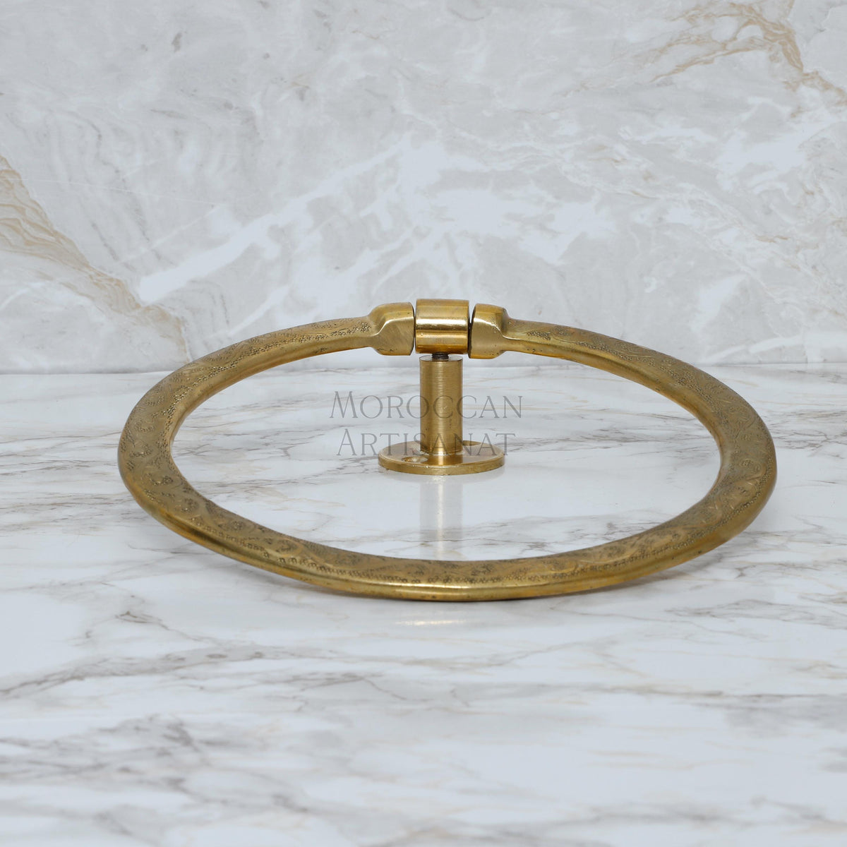 Elevate your bathroom décor with this handcrafted Brass Towel Ring. Made in Morocco, it features detailed hand engraving on solid unlacquered brass. The rotating ring design ensures both style and convenience, making it perfect for everyday use.