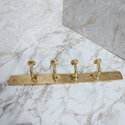 Add functionality and elegance to your home with this handcrafted Wall Hook Rack. Made from solid unlacquered brass, it features four rounded hooks mounted on a sleek brass base. The polished finish develops a natural patina over time, giving each piece unique charm.