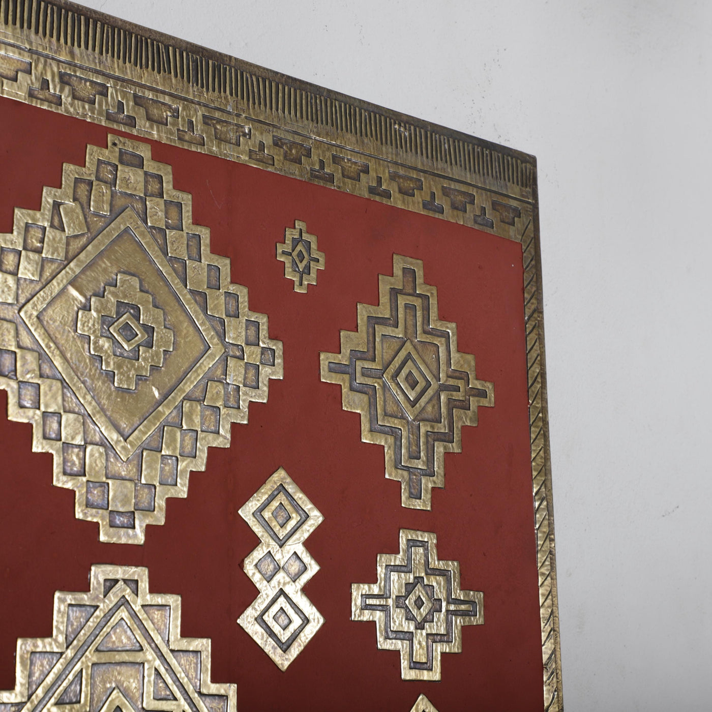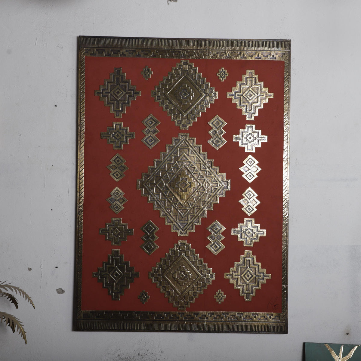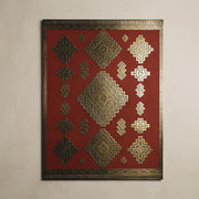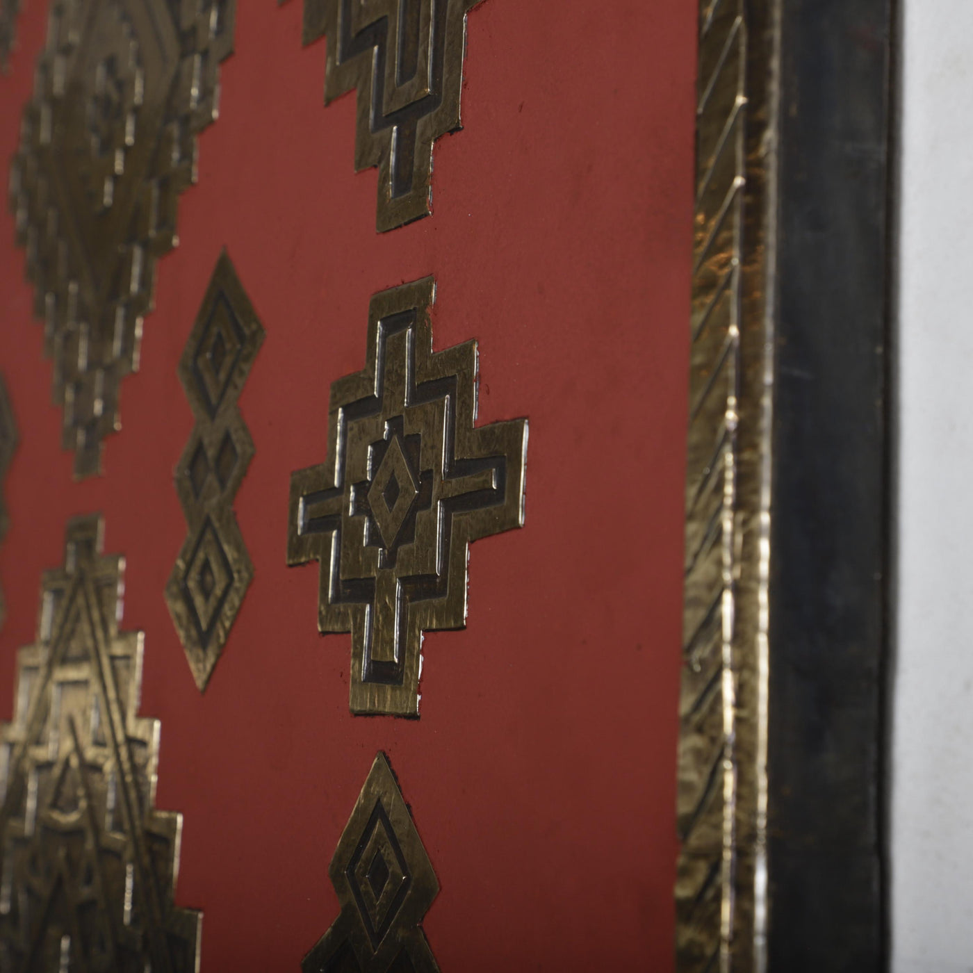Bring heritage and beauty into your home with this Handmade Moroccan Geometric Brass Wall Art. The bold red background is adorned with brass motifs inspired by Berber rug patterns. Each brass inlay is hand-cut and embossed, creating symmetry and depth that highlight Moroccan craftsmanship.
