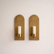 Crafted from solid brass with a smooth brushed finish, each sconce features a softly rounded arch backplate and a clean cylindrical candle cup. The simple silhouette creates a warm glow against the wall, making these sconces a refined accent for both contemporary and classic homes.
